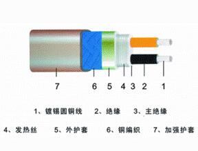電源母線為兩根平行的J緣軟銅線,在內J緣上纏繞鎳鉻電熱絲,并將電熱絲每隔一定距離(即“發熱節長”)與母芯線連接,從而形成連續的并聯電阻。母芯線通電后,各關聯電阻發熱因而形成一條連續的加熱帶,而且可以根據使用情況發熱節長度任意剪接。